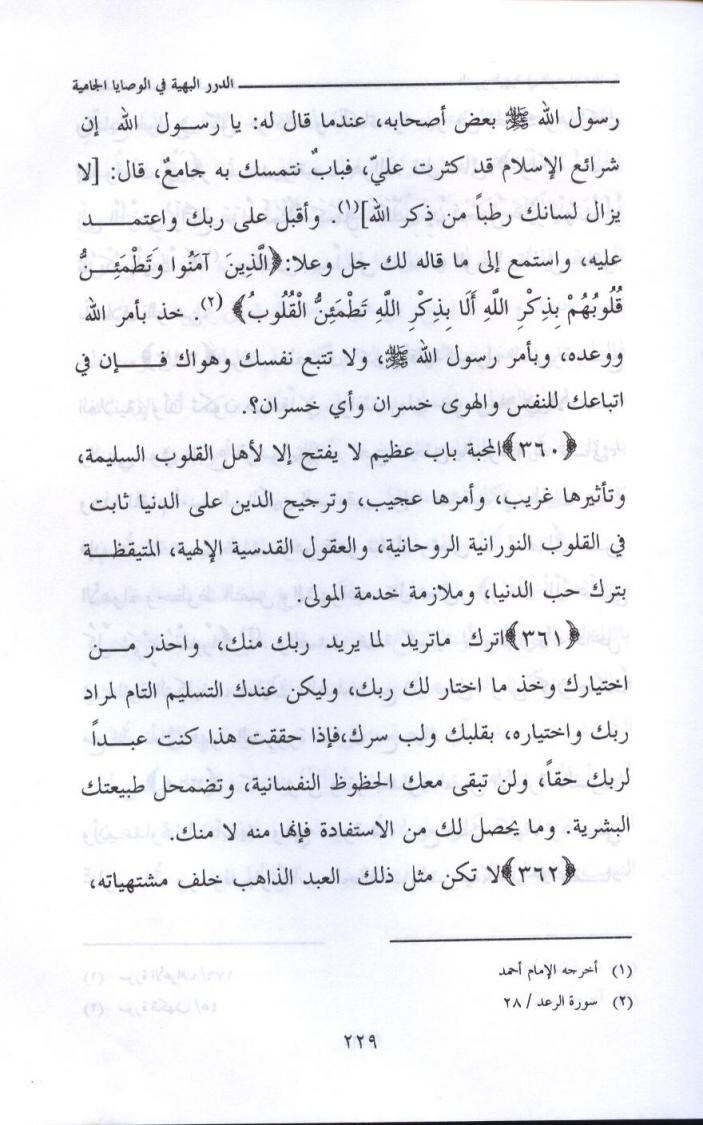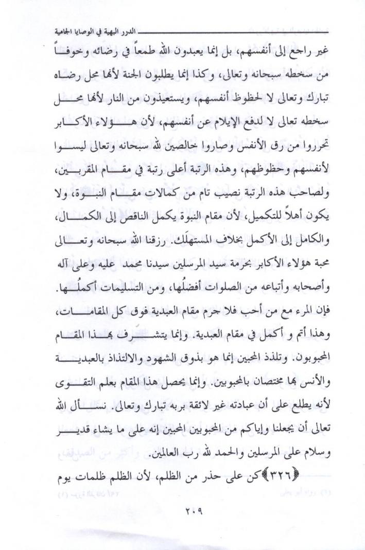 { 300 } لاتخرج بدون قرب من الله جل وعلا وبدون واسطة سيدنا رسول الله صلى الله عليه وسلم ، لأن الخروج بدون قرب ومعية قد يشوش عليك ولا تجمع كما قال ابن عطاء الله السكندري رحمه الله : ( من كانت بدايته محرقة كانت نهايته مشرقة ) . لأن الطرق والأبواب في جسد الإنسان كلها مفتوحة على الدنيا ، كل باب وطريق يقتضي ما كان مناسباً له . ولكن القرب يغلق هذه الأبواب بشرط أن يكون هذا السفر انتهاؤه متعلقاً بابتدائه . تأمل هذا تجده إن شاء الله تعالى . ولا تكن من الناقدين الذين ينقدون بغير فهم ، وانظر إلى نفسك بأنها مقصرة تجد الفتح إن شاء الله تعالى . نرجو الله تعالى أن تكون عبداً متبعاً موافقاً . وصلى الله على سيدنا محمد وعلى آله وصحبه وسلم ، ولا حول ولا قوة إلا بالله العلي