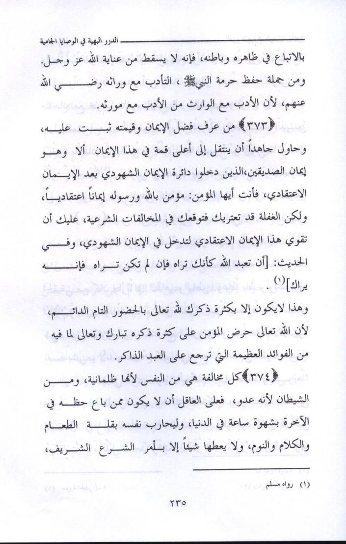 الوصية الأولى : أيها السالك في هذا الطريق الشاذلي اعرف عمن تأخذ دينك ، خذ عن أهل الصدق والاستقامة وحاذر غيرهم ، لأن دينك هو لحمك ودمك ، وكن متبعاً للأحكام الشرعية ، والسنة الشريفة السنية ، في أقوالك وأعمالك وأحوالك ، وتوَّج ذلك بالنية الصادقة التي ترضي الله عزوجل . الوصية الثانية : أيها السالك إذا كنت حريصاً على أن تترقى في مدارج الكمال يجب يجب عليك أن تبتعد عن لقلقة اللسان ، وأن تلازم الصمت إلا إذا دعتك الحاجة إلى الكلام فتّكلم بمقدار الحاجة مع الحضور التام مع حضرة الله تبارك وتعالى . الوصية الثالثة : أيها السالك كن صادقاً في محبتك لخادم الطريقة ، فبصدق محبتك لخادم الطريقة تنقل إلى محبة الرسول صلى الله عليه وسلم ، ومنها تنقل إلى محبة الله عزوجل ، والصادق في المحبة متبع لا مبتدع . الوصية الرابعة : ايها السالك لتعلم أن المريد الصادق قد ـــــــــــــــــــــــــ ص 193 ـــــــــــــــــــــــــــــــــــ يستفيد من شيخه في حالة البعد أكثر من حالة القرب ، لأن القرب قد يكون حجاباً للبعض فيشتغل ببشرية شيخه عن السر الذي أودعه الله تعالى فيه ، فلتتعلق بإيمان شيخك لا بشبحه . الوصية الخامسة : أيها السالك حبك لشيخك لا يكون مانعاً لحب رسول الله صلى الله عليه وسلم وحب رسول الله صلى الله عليه وسلم لا يكون مانعاً لحب الله تعالى فشيخك يأخذ عن سيدنا محمد رسول الله صلى الله عليه وسلم ، ورسول الله صلى الله عليه وسلم يأخذ عن الله عزوجل ، وإيمان شيخك متعلق بإيمان رسول الله صلى الله عليه وسلم ، وإيمان رسول الله صلى الله عليه وسلم متعلق بالله عزوجل . الوصية السادسة : أيها السالك ضعف الهمة يأتي من عدم المجاهدة ، وقلة ذكر الله تعالى ، وقلة الصلاة والسلام على سيدنا محمد رسول الله صلى الله عليه وسلم ، فلابد من المجاهدة بكثرة الذكر لله تعالى حتى تقوى الهمة على الاستقامة الشرعية ، فأكثر من ذكر ـــ لاإلــــه إلا الله ــــ. الوصية السابعة : ايها السالك كن بحالة الطهارة دائماً ، وحافظ على وضوئك ، ولا تنم إلا على طهارة تامة ، وحافظ على صلاة الجماعة في أوقاتها ، وهذا أمر ضروري جداً للسالك الصادق . الوصية الثامنة : أيها السالك لا تشتغل بالخلق ألا بمقدار الضرورة ، وخاصة بعد حضرة الذكر ، ولا تشرب الماء بعد ــــــــــــــــــــــــــــــــ ص 194 ــــــــــــــــــــــــــــــــ الحضرة ، وصل ركعتين سنة التوبة بعد الحضرة . الوصية التاسعة : ايها السالك الصادق المحب اجعل لنفسك ورداً من القرآن الكريم في كل يوم اقرأ جزءاً واحداً مع التفكر والتدبر وحضور القلب ، وبقوة الإيمان على أن هذا الكلام كلام الله تعالى ، وأنه فوق كلام البشر . الوصية العاشرة : أيها السالك حافظ على صلاة النافلة على الشكل التالي : أ ـــ صلاة الضحى ثماني ركعات ، ركعتان تقرأ فيهما بعد الفاتحة سورة الكافرون ، وسورة الإخلاص ، وسورة يس في بقية الركعات . ب ـــ صلاة الأوابين ست ركعات ، ركعتان تقرأ فيهما سورة السجدة ، وركعتان تقرأ فيهما سورة الدخان ، وركعتان تقرأ فيهما سورة الواقعة . ج ـــ صلاة قيام الليل ثماني ركعات ، كما تصلي صلاة الضحى د ـــ صلاة التهجد ثماني ركعات ، ركعتان تقرأ فيهما بعد الفاتحة سورة الكافرون والإخلاص ، وركعتان تقرأ فيهما بعد الفاتحة الآيات العشرة من سورة الكهف ، واربع ركعات تقرأ فيهما ما تيسر من سورة الكهف . وعند الانتهاء من الصلاة تستغفر الله تعالى من الذنوب ــــــــــــــــــــــــــــــــــــ ص 195 ــــــــــــــــــــــــــ والخطرات / 100 / مرة ، ثم تضجع على شقك الأيمن حتى يؤذن الفجر ، ثم تصلي صلاة الفجر مع الجماعة وبعدها تقرأ أورادك وتذكر إلى طلوع الشمس ، ثم تصلي صلاة الضحى . نرجو الله عزوجل أن يمن علينا وعلى المؤمنين عامة ، وأهل الطريق خاصة . بمتابعة النبي صلى الله عليه وسلم ، وأن يختم لنا بالخاتمة الحسنى إنه على ما يشاء قدير ، ولا حول ولا قوة إلا بالله العلي العظيم وصلى الله على سيدنا محمد وعلى آله وصحبه أجمعين . |