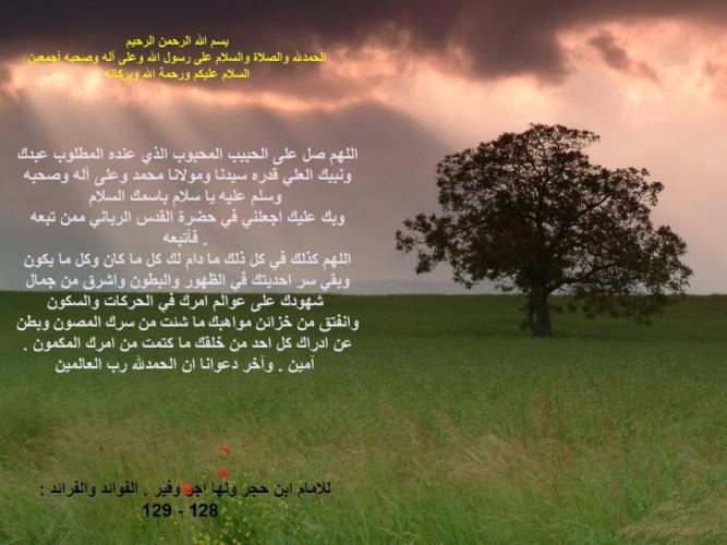 اللهم صل على الحبيب المحبوب الذي عنده المطلوب عبدك ونبيك العلي قدره سيدنا ومولانا محمد وعلى آله وصحبه وسلم عليه يا سلام باسمك السلام