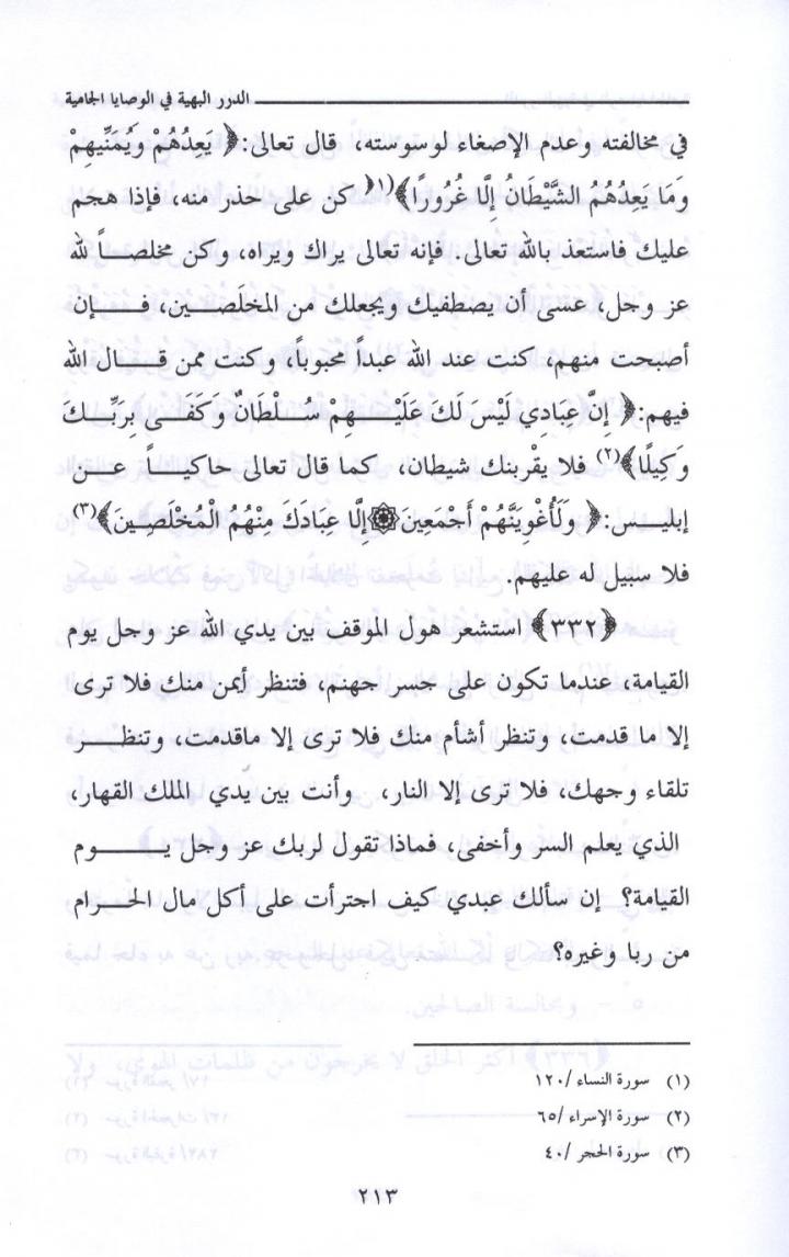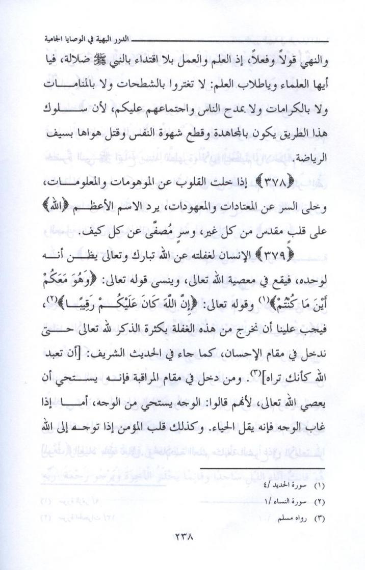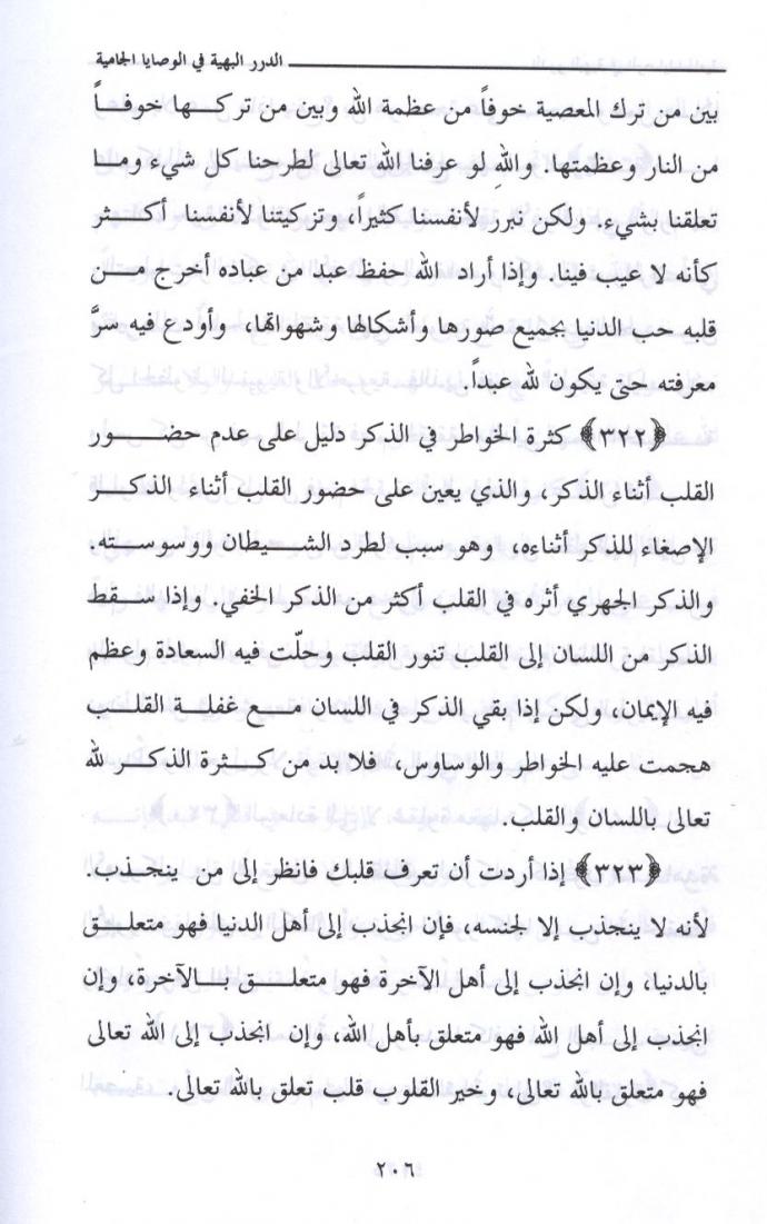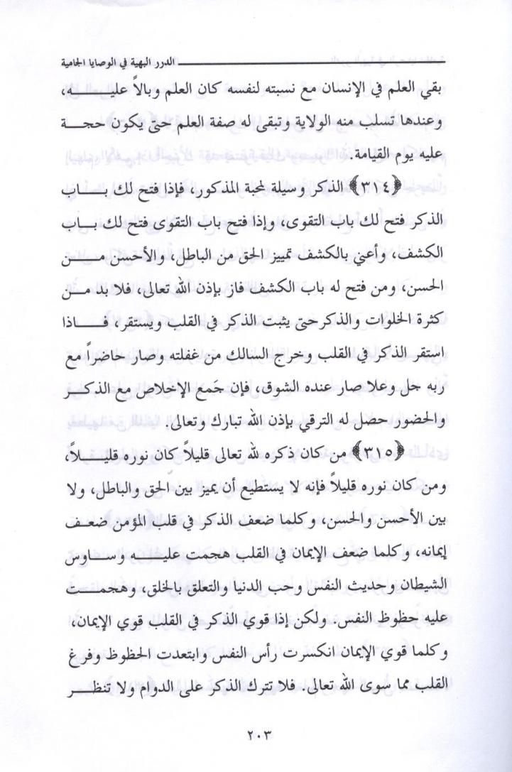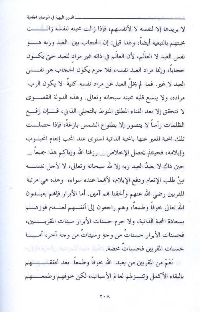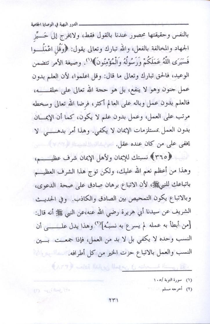 { 300 } لاتخرج بدون قرب من الله جل وعلا وبدون واسطة سيدنا رسول الله صلى الله عليه وسلم ، لأن الخروج بدون قرب ومعية قد يشوش عليك ولا تجمع كما قال ابن عطاء الله السكندري رحمه الله : ( من كانت بدايته محرقة كانت نهايته مشرقة ) . لأن الطرق والأبواب في جسد الإنسان كلها مفتوحة على الدنيا ، كل باب وطريق يقتضي ما كان مناسباً له . ولكن القرب يغلق هذه الأبواب بشرط أن يكون هذا السفر انتهاؤه متعلقاً بابتدائه . تأمل هذا تجده إن شاء الله تعالى . ولا تكن من الناقدين الذين ينقدون بغير فهم ، وانظر إلى نفسك بأنها مقصرة تجد الفتح إن شاء الله تعالى . نرجو الله تعالى أن تكون عبداً متبعاً موافقاً . وصلى الله على سيدنا محمد وعلى آله وصحبه وسلم ، ولا حول ولا قوة إلا بالله العلي