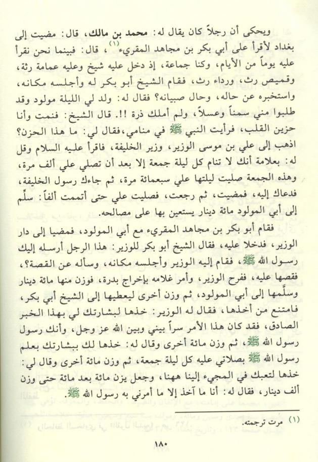 وقال القواريري مات رجل جار لنا وكان وراقاً فرأيته في المنام فقلت له ما فعل الله بك ؟ قال : غفر لي ، قلت : بماذا ؟ قال : كنت إذا كتبت النبي صلى الله عليه وسلم ، كتبت : " صلى الله عليه وسلم " . |