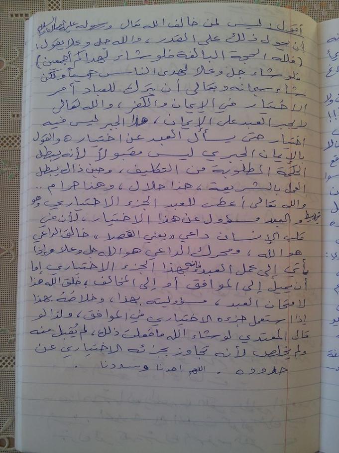 من إملاءات شيخنا حفظه الله تعالى حول إحدى آيات المنتخبات من القرآن الكريم الملحقة بالكتاب وبخط اليد