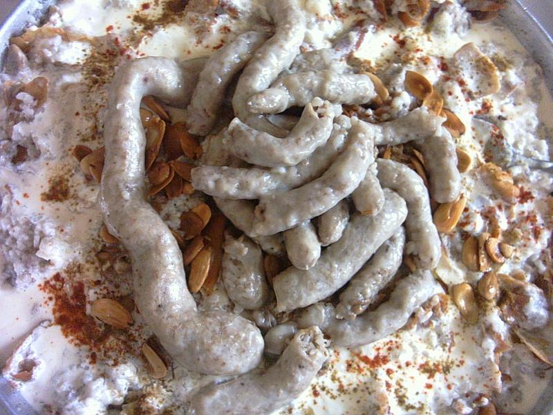 24- ططماج : يمد العجين و يقطع و يطبخ في الماء حتى يستوي و يوضع عليه اللبن و النعنع و الثوم و السمن و اللحم المقلو .