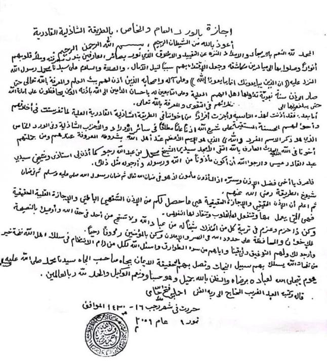 افتراضي الاجازة بالورد العام والخاص والارشاد من سيدنا الشيخ احمد فتح الله جامي رحمه الله لسيدي الشيخ محمد رجو حفظه الله