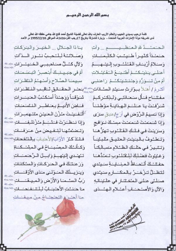 كلمة ترحيب بسيدي الحبيب والعالم الأريب العارف بالله تعالى فضيلة الشيخ أحمد فتح الله جامي حفظه الله تعالى لدى تشريفه دولة الأمارات العربية المتحدة - بزيارة للشارقة بتاريخ 17 رجب الفرد 1416 هــ الموافق /10 /12 /1995 م . الأحد