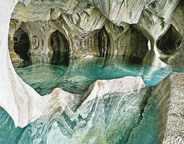 وتمتد بحيرة كاريرا على طول الحدود الواقعة بين تشيلي والأرجنتين وهي ذات انعكاسات تركوازية ومشبعة بالكوبالت بشكل كبير وتعد هذه البحيرة ثاني أكبر بحيرة في أمريكا الجنوبية . ومنذ العصر الجليدي الثاني أي منذ أكثر من عشرة آلاف سنة تعمل مياهها المضطربة على تليمع ونحت المرمر الأبيض الموجود على الضفاف، وتحمل معها حصى الشواطئ المحيطة، حيث يعمل هذا الحصى على حك أو كشط هذه الصخور الناعمة المتفرعة من الجير أو الصخر الكلسي . والواقع أن 90% من التجاويف أو الكهوف في أنحاء العالم تشكلت من صخور تتبع هذه الفئة (الجيرية) أو المسماة علمياً “الكربونية” أي “ملح الحمض الكربوني” ويعرف عن هذه الصخور أنها ذات نفاذية جيدة وقابلية للتشقق أو التصدع، فمياه الأمطار التي تتحول إلى مياه حمضية بفضل الغاز الكربوني في التربة تنفذ إلى التشققات الدقيقة وتعمل على إذابة الصخرة الأمر الذي يؤدي إلى توسيع الثغرات بشكل تدريجي وحفر الممرات، ويطلق الجيولوجيون على هذه الظاهرة التكوينات الكارستية نسبة إلى مقاطعة كارست الشهيرة بالحجر الجيري في جبال الألب الدينارية في يوغوسلافيا السابقة .