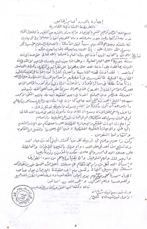 أما بعد : فقد أذنت لهذه المناسبة وأجزت أفراداّ من إخواننا في الطريقة الشاذلية القادرية العلية لما تفرست في أخلاقهم وأحوالهم الحسنة المستقيمة على شرع الله إذناً عاماً مطلقاً في سائر الأوراد والأحزاب الشاذلية وفي الورد الخاص الذي هو ذكر الاسم المفرد { الله } الذي هو الاسم الأعظم عند أهل الله بشروطه المعروفة عندهم ومن جملتهم أخونا في الله الفقيه العارف بالله التقي الأمجد سيدي الشيخ أحمد فتح الله جامي كما أذن لي أستاذي وشيخي سيدي محمد بن الهاشمي وأرجو الله أن أكون مأذونا من الله ورسوله وأرجو له مثل ذلك .
