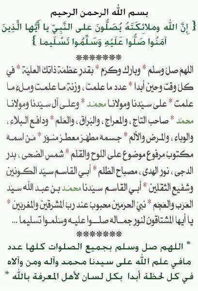 اللَّهُمَّ صَلِّ عَلَى سَيِّدِنَا مُحَمَّدٍ قَدْرَ لاإِلَهَ إِلاالله فَهُوَ الْحَبِيبُ الَّذِي لايُدْرَكُ مُنْتَهَاه* وَلايُعْرَفُ مَعْنَاه* فَصَلِّ اللَّهُمَّ عَلَيْهِ عَدَدَ حَبَّاتِ الرِّمَاِلِ وَذَرَّاتِ الْهَوَاءِ وَقَطَرَاتِ الْمِيَاه* صَلاةً تَعْنُو بِهَا الْوُجُوهُ لِلرَّبِّ وَتَسْجُدُ الْجِبَاه* فَإِنَّهْ النَّبِيُّ الْعَبْدُ الْعَابِدُ الأَوَّاه* الَّذِي فَاقَ عِبَادَ الله* فِي أَرْضِهِ وَسَمَاه* وَأَشْرَقَ سَنَاه* وَعَظُمَ ثَنَاه* فَلَيْسَ لهُ نَظِيرٌ وَلاأَشْبَاه* الْمُنَزَّل عَلَيْه {وَقَضَى رَبُّكَ أَلا تَعْبُدُوا إِلاَّ إِيَّاه*} فَصَلِّ اللَّهُمَّ عَلَيْهِ صَلاةً يَهُبُّ عَلَيْنَا بِهَا عَبِيرُ شَذَاه* فَيُطَيِّبُ الْقُلُوبَ وَيُعَطِّرُ الأَفْوَاه* صَلاةً تَدُومُ وَتُضَاعَفُ مِن بَدْءِ الْخَلْقِ إِلَى يَوْمِ أَنْ نَلْقَاكَ وَنَلْقَاه* إِلَى حَيْثُ لا نِهَايَةَ لِكَمَالِ الله* وَعَلَى آلِهِ وَصَحْبِهِ وَسَلِّمْ