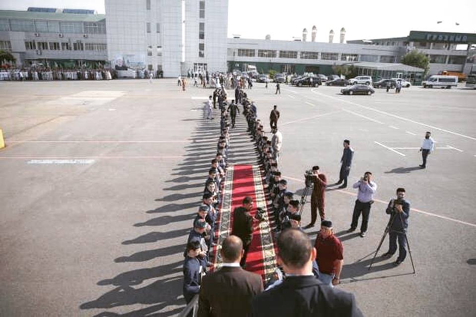 مشهد مهيب لحفظة القرآن من مدارس الشيشان وهم مصطفون في استقبال فضيلة الإمام الأكبر شيخ الأزهر وأيديهم تحمل المصحف الذي حفظته قلوبهم الطاهرة البريئة.