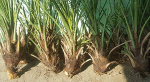 تنقيع منطقة الجذور في محلول فطري لزيادة نسبة نجاح الفسيلة وتجنب حالة التقزم التي تصيب بعض غراس النخيل.