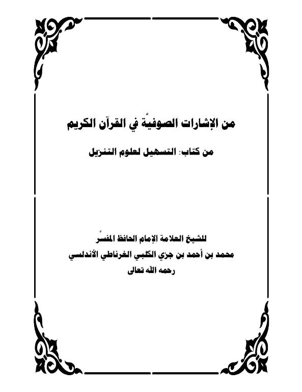 من الإشارات الصوفية في القرآن الكريم من كتاب التسهيل لعلوم التنزيل للشيخ العلامة الإمام الحافظ المفسر محمد بن أحمد بن جزي الكلبي الغرناطي الأندلسي رحمه الله تعالى :taht yalhabib: تم رفعها بصيغة البدف وبصيغة الوورد مرسلة إلينا عن طريق بعض الاحباب جزاهم الله خيراً |