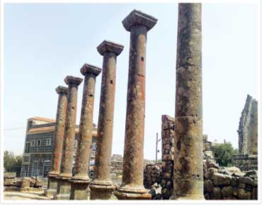 ما إن يأخذ الزائر طريقه إلى تلك المدينة المرتفعة حتى يدخل في منظر تتزاوج فيه المباني الحجرية المشادة من الحجر الأسود القديم والمباني الحديثة في تناغم لا يؤذي المظهر العمراني للمدينة، ويبقى الطريق ضيقاً إلى أن يصل إلى ساحة المدينة المعبدة بالحجارة، حيث يتسع الطريق مباشرة أمام عينيه ليصبح الطريق ساحة وهنا يتوقف لمدة مفاجأ بما يراه، فالساحة مبلطة بالحجارة البازلتية بمساحة تزيد على ألفي متر تتصل بطريق مبلط إلى موقع الحمامات والفندق الخاصين بالمدينة القديمة، على الطرف المقابل من الساحة تقبع أمامه مدينة أثرية مسورة يرتفع جدارها أكثر من سبعة أمتار وفيه العديد من الشبابيك وما إن يقترب منها حتى يقرأ لافتة كتب عليها “معابد قنوات”، وبالعودة إلى تاريخ المدينة وحسب ذكر أحد القائمين على المدينة ل”الخليج” أن “قنوات” مدينة ذكرت في العديد من المصادر التاريخية والدينية لعدد من الشعوب والديانات، فقد ذكرت في المصادر الرومانية باسم “كاناثا” وهو الاسم الأكثر شهرة للمدينة، في حين ذكرت في المصادر اليونانية واللاتينية باسم “كانوتا” وأصل التسمية قناة واشتهرت المدينة بالقنوات التي تمد المدينة بالمياه وتمتد من الخزان الذي يقع شرقي المدينة إلى المعبد ثم إلى الوادي غربي المدينة الذي تقبع فيه العديد من المعابد إضافة إلى المسرح الروماني الذي ما زال محافظاً على شكله حتى الآن، ويشير المصدر إلى أن “كاناثا كانت مركزاً دينياً وأسقفياً رومانياً وبيزنطياً مهماً وما تزال مسكونة منذ ذلك الوقت وحتى الآن، ويشهد على ذلك ما تبقى من آثارها القائمة من أبنية ملكية ومعابد وساحات وطرقات، أما المعابد الموجودة في ساحة البلدة فيمكن للزائر تقسيمها إلى قسمين الأول ما هو موجود في ساحة البلدة من معابد وما يجاورها وهي السراي أو معبد “زيوس ميجيستوس” (معبد المنصة) والخزان أو ما يسمى المدينة العليا وتضم مواقع دينية كبيرة ويعود استعمال هذه الأماكن إلى العصر الحديدي وما قبل ذلك، وهي محاطة بأسوار عالية على شكل أحجار أسطوانية و”بلوكات” حجرية كبيرة لا يزال بعضها موجوداً إلى اليوم، وتتشكل من بناء ضخم للمواقع الدينية يمتد على ثلاثة “تراسات” باتجاه الجنوب، صعوداً من “السراي” حتى معبد “زيويس ميجيستوس”، كل من هذه “التراسات” كان يضم معبداً مستقلاً وأبراجاً إلا أن المعبد الأقدم والأكبر في المدينة الأثرية في “مبنى السراي الغربي” وهو عبارة عن معبد عريض يتميز بأن الهيكل “قدس الأقداس” فيه يتكون من محراب بثلاث قبب، وإلى الشرق من المعبد “بازليك” كبيرة ثلاثية الأجنحة كانت تستخدم في “العصر الروماني” كصالة تجارة وترجح المصادر التاريخية أن يكون الجزء السفلي الذي يسمى “السراي” هو المركز التجاري للمدينة، ويبرز على “التراس الثاني”، “منصة” كان يتموضع عليها أصلاً معبد عريض آخر، وأمام المبنى خزان كبير مع دعامات وقناطر، مغطى في الأصل ببلاط حجري أما على “التراس الثالث” والأعلى فقد كان يوجد ما يسمى “المعبد الجنوبي” الذي كان مهدى، وفق النقوش الكتابية، إلى “زويس ميجيستوس” وتؤكد هذه المجموعة المتكاملة وجود مخطط دقيق يرجع لأواسط القرن الأول قبل الميلاد، وإلى أن إنجاز هذه الأبنية تم في وقت قصير نسبياً، ويضيف المصدر ان هذا الجزء من المدينة يحوي مباني تجارية وإدارية إضافة إلى الخزانات، ويشير المصدر إلى مجموعة الكنائس أو ما تسمى “البازليك” فقد أقيمت على أنقاض معبد “أثينا” إلهة الحكمة وهي ذاتها السرايا أو ما تعرف بدير النبي أيوب وقد أعدت للعبادة المسيحية بين القرنين الرابع والخامس الميلادي، وعند اتجاه الزائر إلى الوادي يلحظ العديد من الأوابد من معابد ومدرج روماني وغيرها، وتلفت انتباهه أعمال الترميم والتجميل التي قامت بها حملة تطوعية من الاتحاد الوطني لطلبة سوريا للمحافظة على حيوية المكان ورونقه وإعادة الألق إليه عبر وضع الشاخصات التي تدل على المعابد والجسر والقيام بتنظيف المكان وتجميله ووضع 
